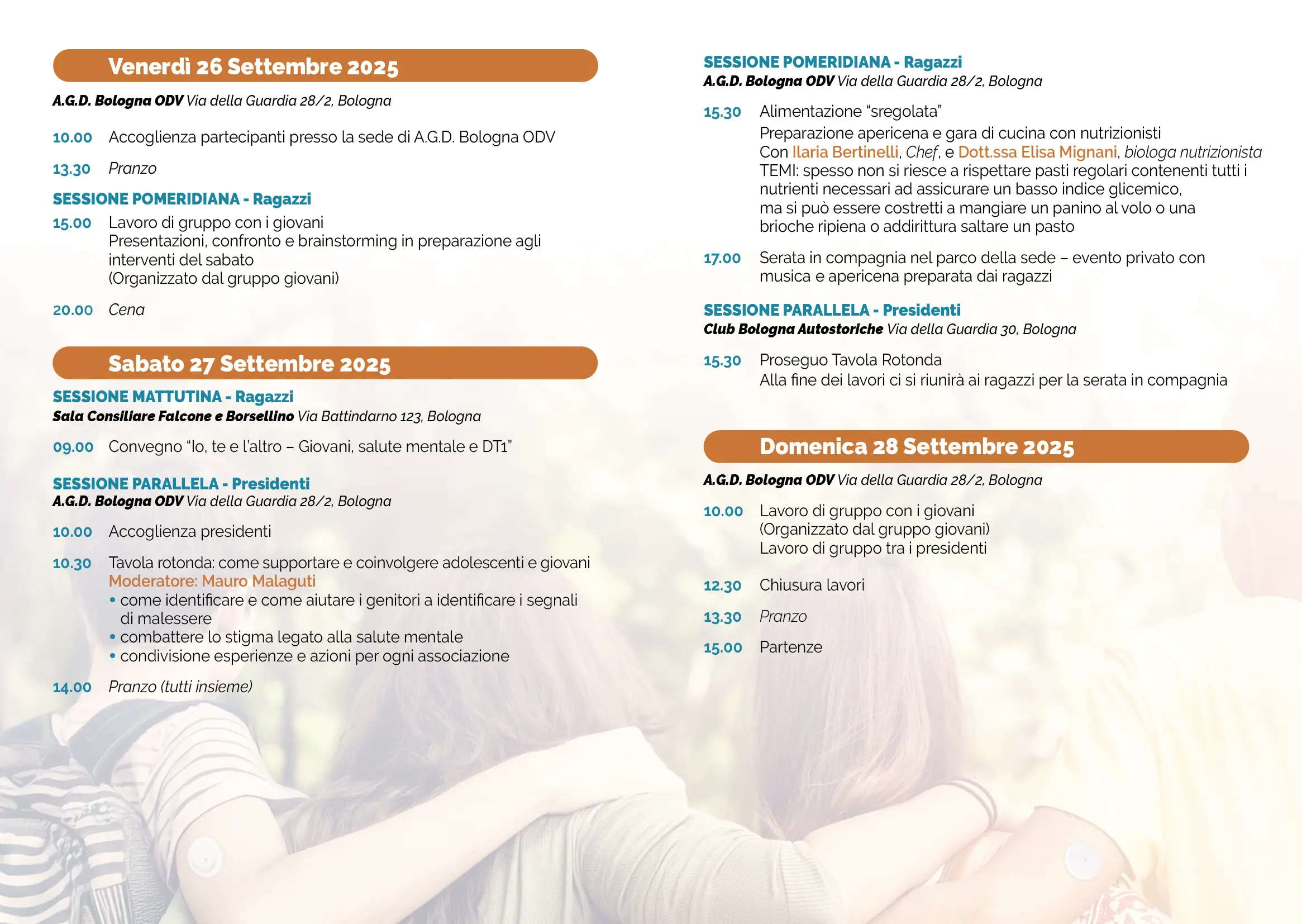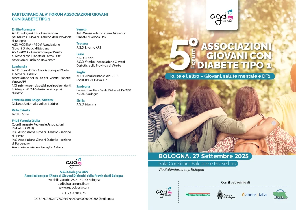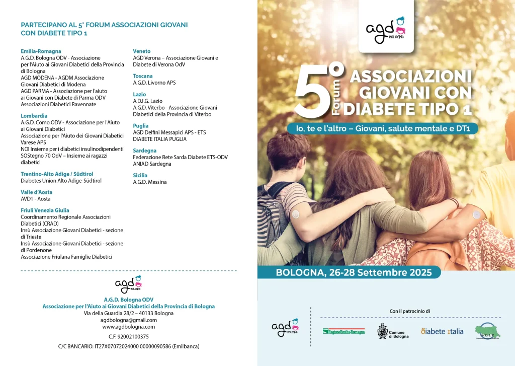 Dal 26 al 28 settembre 2025, Bologna ospiterà la quinta edizione del Forum delle Associazioni Giovani con Diabete Tipo 1, promosso da A.G.D. Bologna ODV, Associazione Giovani Diabetici della Provincia di Bologna.