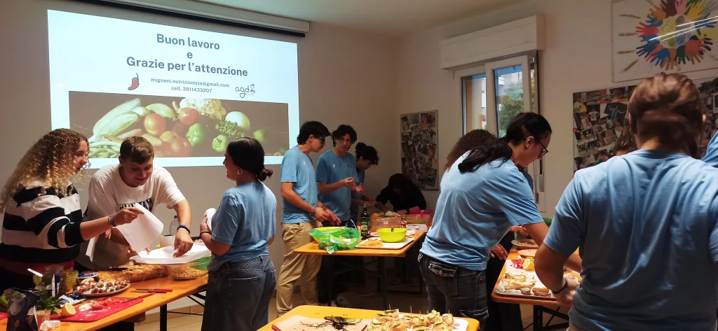 Nel pomeriggio, le ragazze e i ragazzi si sono divisi in due gruppi: alcuni hanno seguito un training course del progetto Erasmus plus vinto da A.G.D. Bologna dal titolo “Diabete Typer Opportunity!”; gli altri hanno seguito un laboratorio di cucina con la chef Ilaria Bertinelli. Sono stati tutti bravissimi e si sono impegnati tantissimo! Preparare l’apericena non è stato solo un gioco, ma anche un modo per toccare con mano le difficoltà quotidiane e trovare soluzioni creative. I ragazzi si sono anche cimentati nella preparazione delle pizze, un momento che unito all’arrivo del Dj ha dato inizio alla serata.